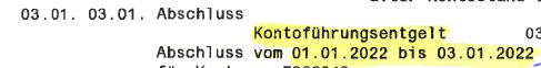 Aus meiner Sicht ist das nicht rechtens, weil das Girokonto zum 31.12.2021 gekündigt wurde. Wenn dann hätte meine alte Bank die Kontoführungsgebühren anteilig für die drei Tage in Januar (01.01. - 03.01.2022) mir berechnen müssen.