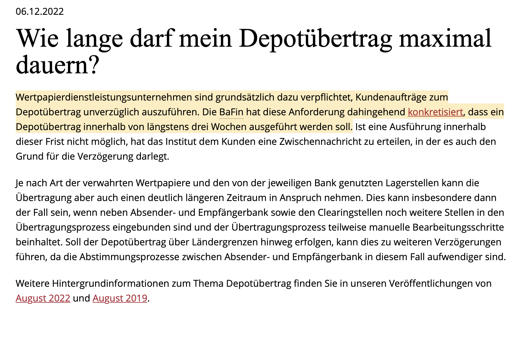 vielen Dank für Ihren Auftrag. Ihre Weisung bzgl. des Depotübertrags wird derzeit von uns bearbeitet.