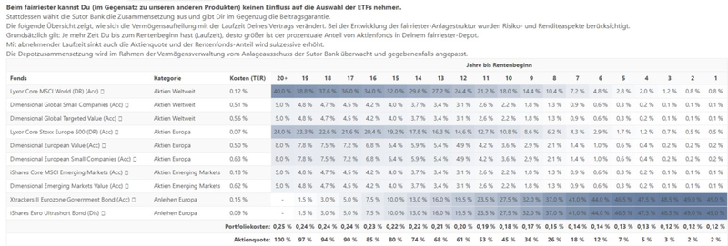 Das ist alles gut und schön, mir geht es darum das man ja genau dieses Produkt damit beworben hat, das man nicht im Cash oder in Anleihen landet, wenn der Markt mal ein wenig mehr nach unten geht. Oder das man in Anleihen investiert. Das ist einfach eine Täuschung am Kunden der dieses Produkt abgeschlossen hat. Im Vertrag ist kein Cash vorgesehen. Da steht keine Silbe von Cash. Oder das 30 Jahre vor der Rente in Anleihen investiert wird. Für mich ist das ganz klar eine Verbraucher Täuschung! Selbst Finanz Tip hat sich davon blenden lassen! Es sind ja auch ganz plötzlich die alten Unterlagen auf der Fair Seite alle verschwunden. Daran sieht man ja das Spuren verwischt werden sollten. Auf der Fair Seite war das Port Folio genau abgebildet in das Investiert werden sollte.