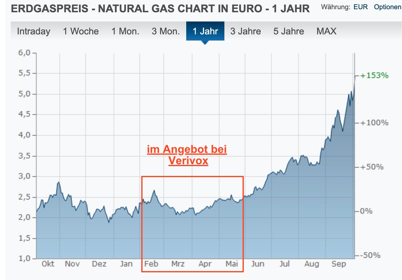 Ausgewertet wurden die monatlichen Gesamtkosten nach einem realistischen Modell des Gasverbrauchs im Verlauf eines Jahres (Annahme: Gas nur zum Heizen; Jahresverbrauch 25.000 kWh).