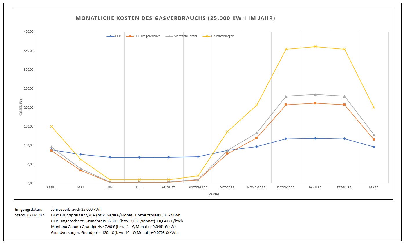 Verglichen habe ich die Kosten von: DEP (das Original mit starrem Basispreis), DEP-umgerechnet (Grundpreis in Arbeitspreis umgerechnet), Montana Garant und einen Grundversorgertarif.