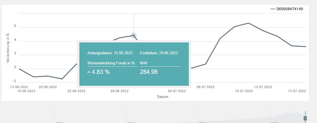 Beispielsweise wird für den 05.07.2022 ein NAV von 272,08 ausgewiesen. Veröffentlicht werden diese Werte auf der Website glaube ich noch vor Anbruch des Folgetages, also für diesen Wert vor dem 06.07.. Fondsanteile, die am 05.07. gekauft wurden, kosteten also 272,08€ (exkl. Ausgabeaufschlag), und für einen Verkauf eines Anteils hat man den gleichen Betrag erhalten.