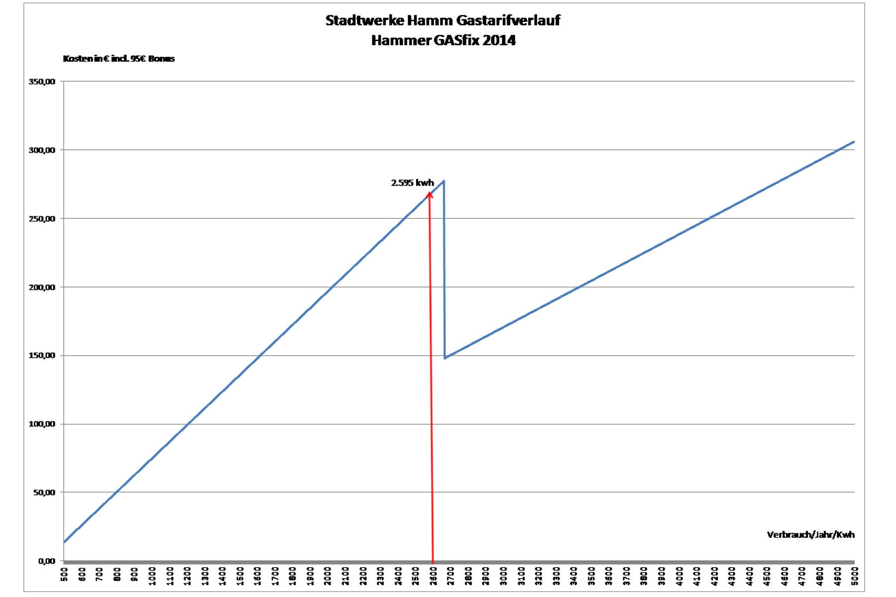 Zum 01. Oktober 2013 hatte ich einen Gasliefervertrag bei den Stadtwerken Hamm, Tarif "HammerGASfix2014", abgeschlossen. Der Vertrag beinhaltete einen Grundpreis von 61,93€/Jahr sowie einen Arbeitspreis von 6,78 Cent/Kwh. Hinzu kam ein Neukundenbonus von einmalig 95,00 €. Mein Vorjahresverbrauch belief sich auf 4.500 Kwh. Aufgrund des milden Winters 2013/2014 reduzierte sich mein Verbrauch im folgenden Abrechnungsjahr auf 2.595 Kwh. Die Überraschung kam mit der Abrechnung. Statt der erwarteten 142,87€ (61,93€ + 2.595kwh x 0,0678€ - 95,00€) wurden mir satte 268,87€ in Rechnung gestellt. Dies entspricht einem Zuschlag von sagenhaften 88%.