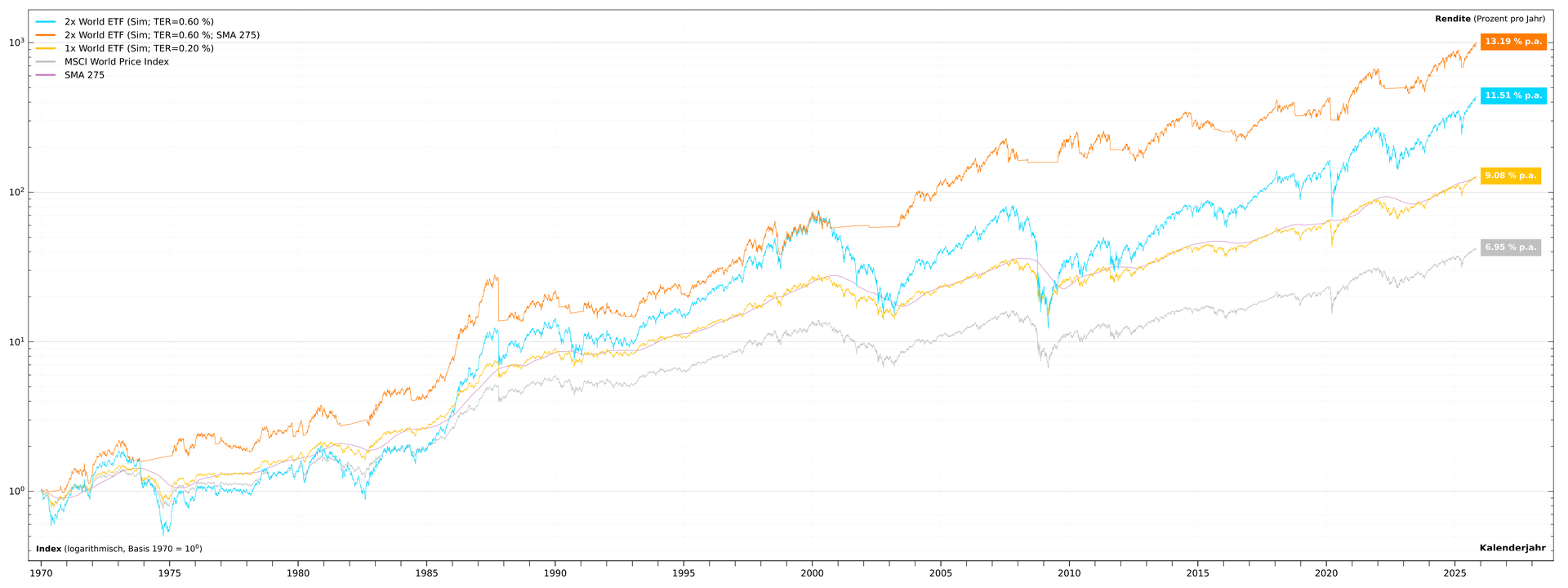 Die SMA Strategie ist mir bekannt, da hab ich mich seit meinen Beiträgen aus dem Frühjahr intensiv mit befasst. Basierend auf dem tollen Video von Notgroschen habe ich mir auch die Historie des 2x Leveraged World für den 275-Tage SMA-Wert näher angeschaut und interessehalber mal versucht, den gehebelten World für den vollen Zeitraum seit 1970 zu simulieren. Schwierig ist hier, dass es zwar historische Kurse gibt, aber man für einen hypothetischen leveraged ETF die Net Total Return daten braucht, also inklusive der Dividendenerträge. Die sind hier statistisch modelliert, daher ist das alles etwas mit vorsicht zu genießen.