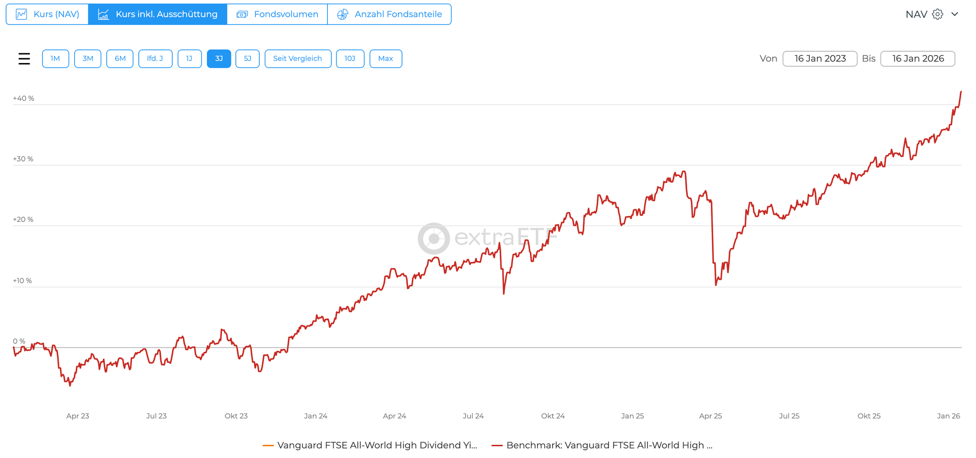 Im Umkehrschluss heißt das auch, für die Wertentwicklung (vor Steuern) spielt es erstmal keine Rolle, ob du eine Ausschüttung erhältst, oder ob du stattdessen Anteile im identischen Nennwert verkaufst. Denn im Szenario "Verkauf statt Dividende" ist der Wert des Anteils, also der Kurs, einfach proportional höher. Es nimmt sich nix. Wohlgemerkt vor Steuern.