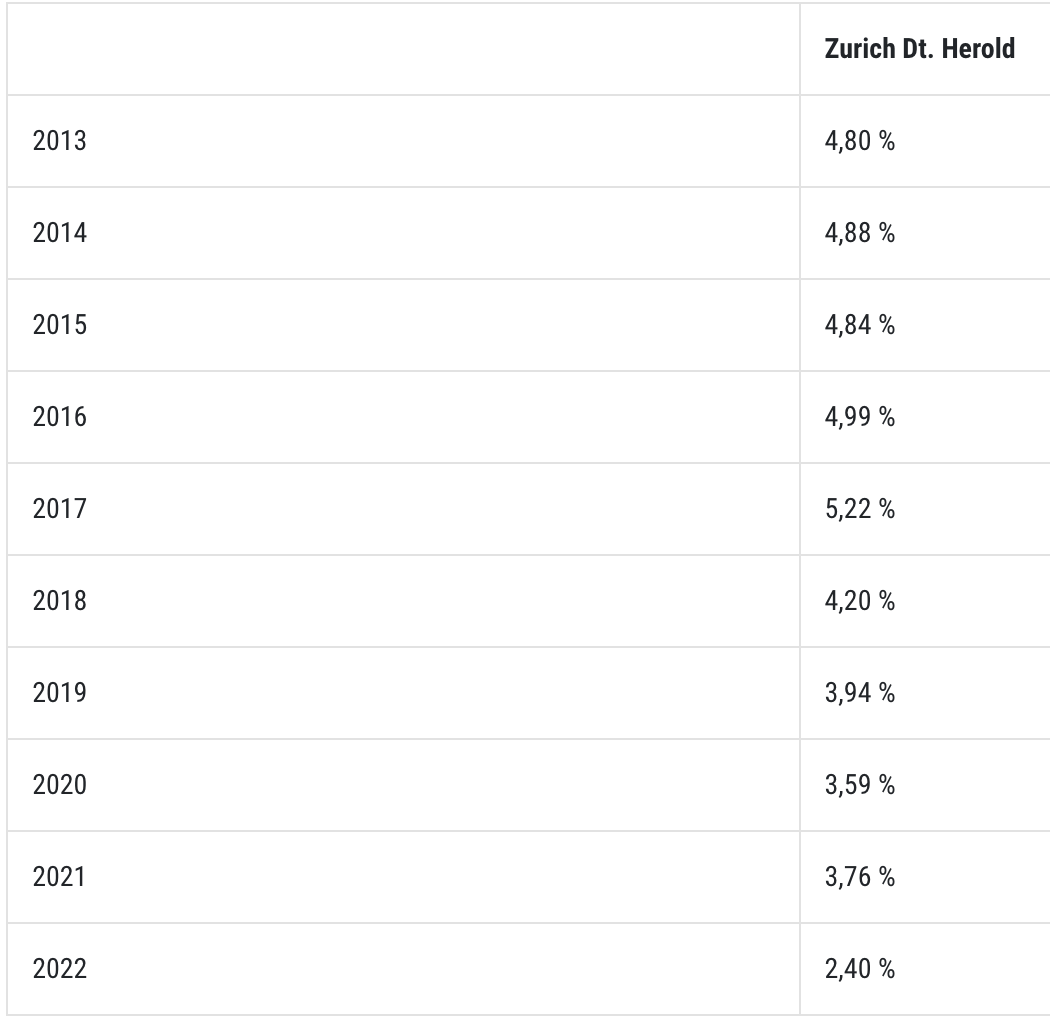 Es fällt auf jeden Fall auf, dass ca. 20% der Anlage aktuell in das Sicherungsvermögen/den Deckungsstock der Zurich investiert sind zur Darstellung der Beitragsgarantie, die der Vertrag enthält. Die Rendite im Deckungsstock der Versicherer ist naturgemäß etwas niedriger als die Anlage in einem breit gestreuten Fonds oder ETF. Einen Auszug davon habe ich mal angehangen. Im Vergleich zu den meisten Versicherern legt die Zurich das Geld offensichtlich recht gut an wenngleich es mit einem breit gestreuten Aktieninvestment nicht mithalten kann.