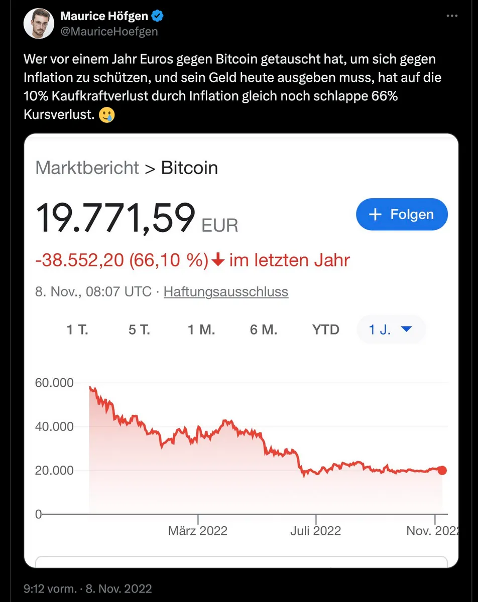 – Ich finde den Thread hier nur komplett sinnbefreit, da einfach mal Tatsachen vertauscht werden. Rückwirkend betrachtet hat der Höfgen, im Vergleich zum Reher, einfach mal alles falsch vorhergesagt in Bezug auf Bitcoin und jetzt wird der Reher hier infrage gestellt, obwohl es eigentlich andersrum sein müsste?! Klärt mich bitte auf ... ![]()