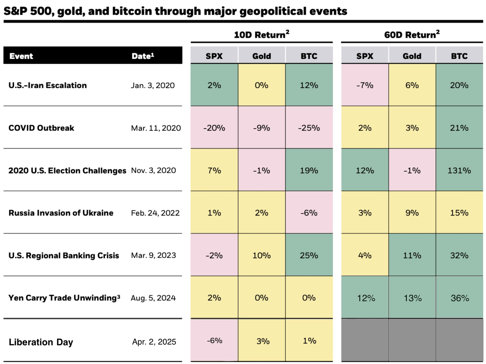 Hier ist eine Übersicht, wie sich verschiedene Assets während und nach zentralen geopolitischen Ereignissen (10 Tage und 60 Tage nach dem jeweiligen Ereignis) in den letzten 5 Jahren verhalten haben: