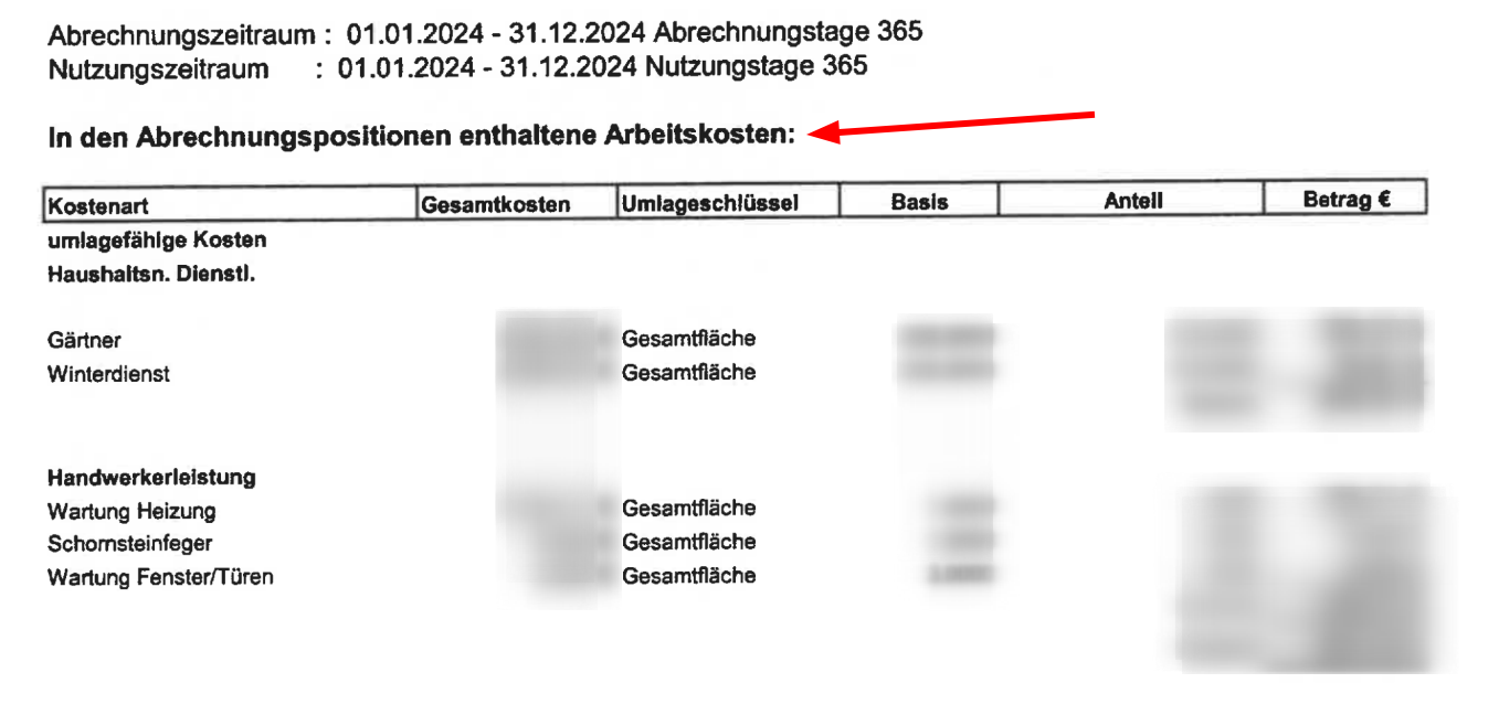 wir bekommen von unserem vermieter in der nebenkostenabrechnung immer die kosten aufgesplittet, so dass jede mietparter die gesamtkosten (arbeitslohn) und ihren jeweiligen anteil erkennt. den kann ich dann einfach 1:1 in die steuererklaerung uebertragen und bekomme dann x-prozent oder max x vom finanzamt zurueck. dein vermieter muss die das ausstellen, damit du das einreichen kannst. bekommen wir nun immer so, seit ich das erste mal danach gefragt habe. die bilder anbei sollten dir einen guten eindruck geben. wir wohnen in einem grossen haus, wo jeder der drei mietparteien dieses schreiben bekommt. z.b. wird der gaertner gesamtarbeitskosten betrag dann durch 3 geteilt und wir zahlen das.... du musst also nur rausbekommen (durch das schreiben des vermieters) welcher arbeitskostenanteil auf deine kappe geht, alles summieren und eintragen.