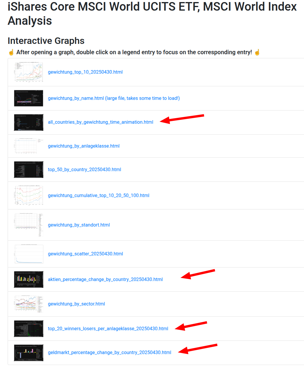 hallo in die runde, ich habe die graphen mal aktualisiert und noch ein paar neue reingepackt, die die aenderrungen zum letzten monat visualisieren. die graphen visualisieren den ishares msci world ueber den verlauf der zeit und wie sich die asset allokation von monat zu monat verschiebt durch das rebalancing. wenn ihr in einem graphen in der legende auf einen eintrag doppelt klickt, wird dieser fokussiert. am besten auf einem grossen monitor anschauen, fuers handy dann doch zu grosse charts