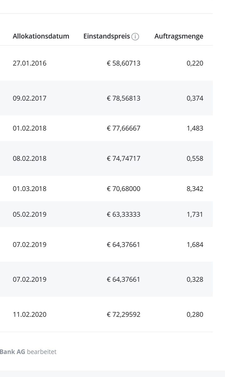 Beim Depot meines Arbeitgebers werden mir chronologisch geordnet die Einstandspreise mit den zugehörigen Allokationsmengen gezeigt (Siehe Beispiel im Anhang). Z.B. Beim ING-Depot wird nur der mittlere Gewinn angezeigt, nicht die Liste der Einstandspreise. Der ING muss diese Liste aber vorliegen, um die Abgeltungssteuer bei Teilverkäufen korrekt zu berechnen.
