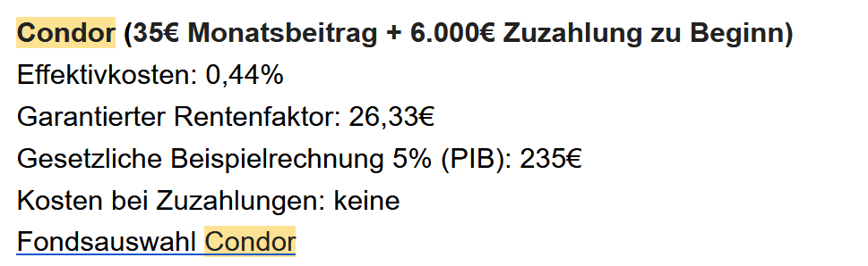Sorge bereitet mir nur, dass man seine Altervorsorge in großen Teilen in die Hand einer Versicherung legt. Condor ist zwar keine Pommesbude, sondern gehört zur R+V Versicherung, aber ich traue Versicherungen nur bedingt.