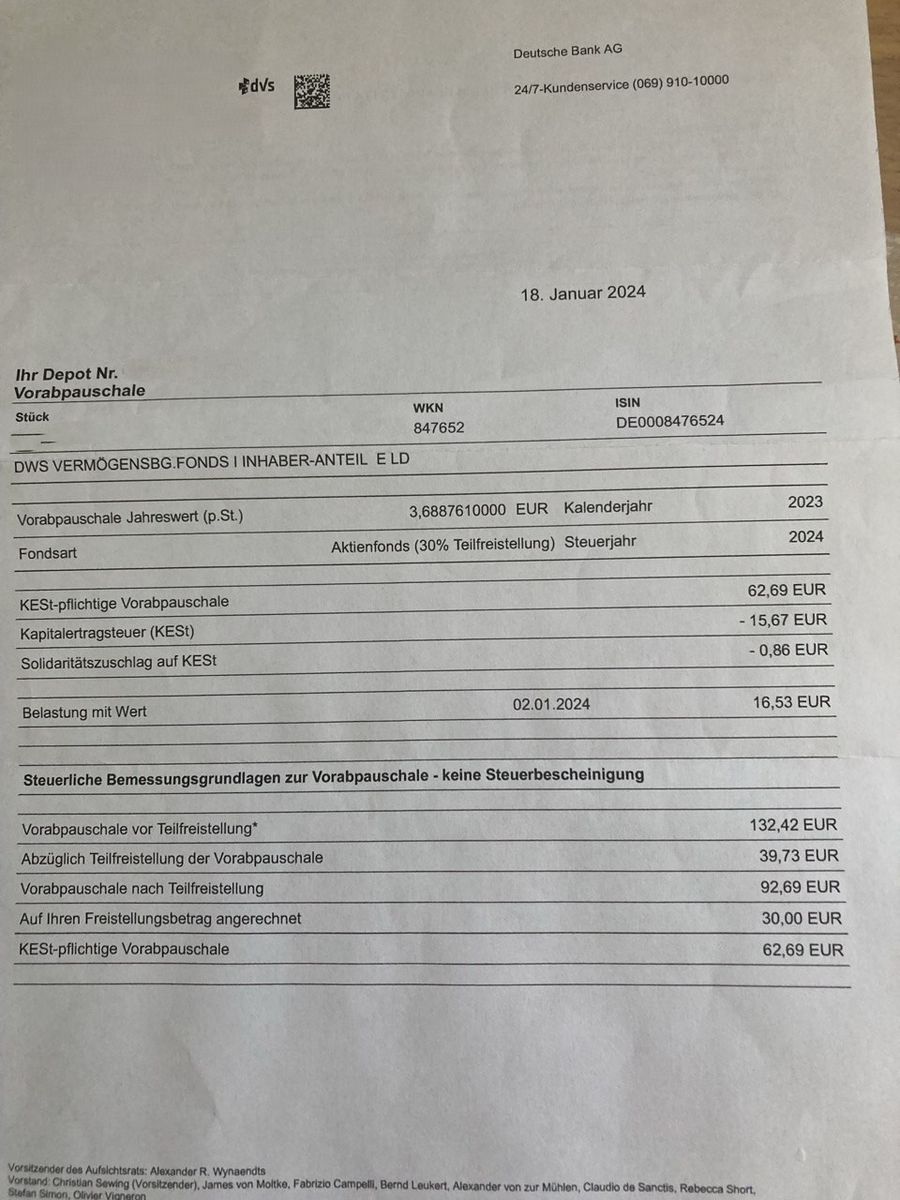 Ich nehme den Rücknahmepreis vom Fonds vom 1.1. bzw. 2.1 eines Jahres, multipliziere mit dem Basiszins des Jahres, berechne davon 70 % und erhalte so den Basisertrag für das Jahr .......wenn ich keine Ausschüttungen habe, vermindere ich das um 30% und habe so eine Vorabpauschale nach Teilfreistellung pro Anteil ... das müsste ich dann auf die Anteile hochrechnen" und davon gehen dann 25 % Kapitalertragssteuer und 5,5 % Soli ab ......