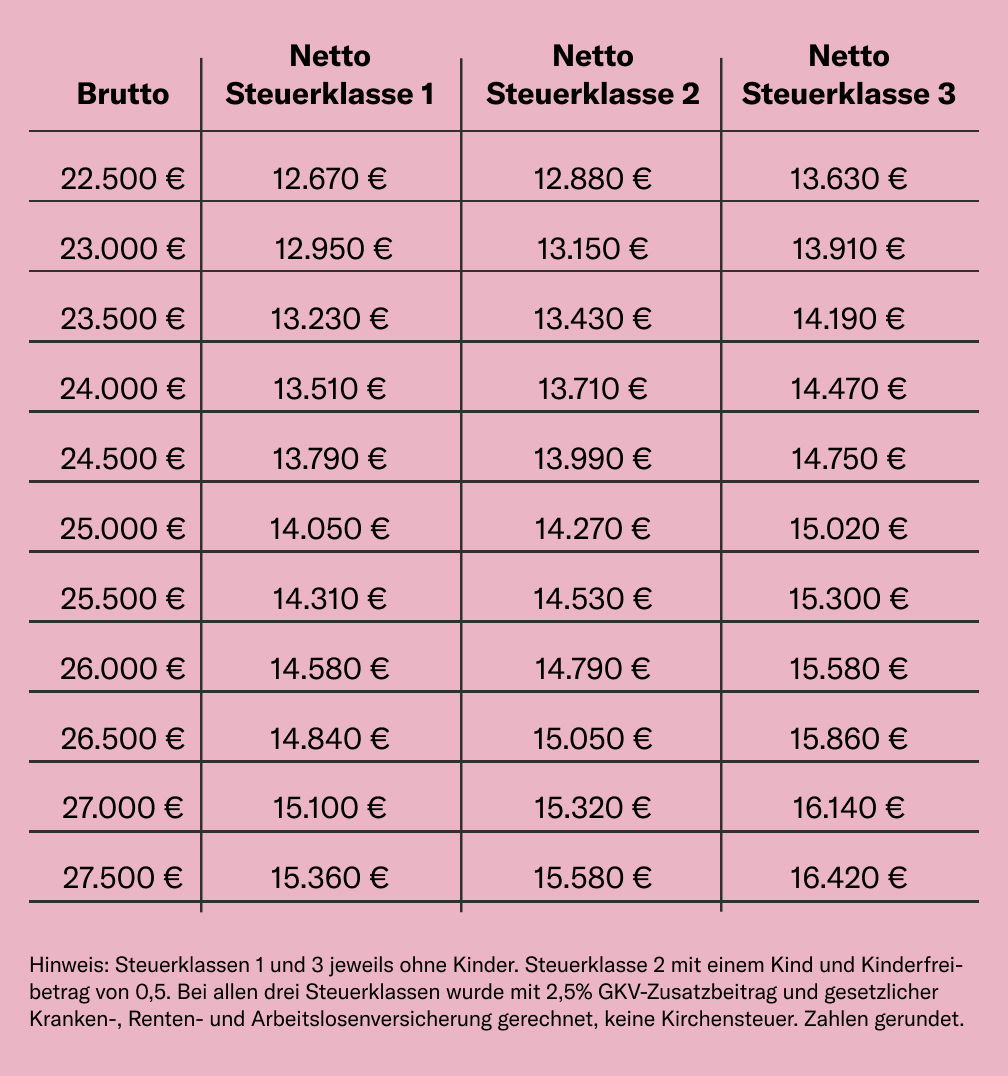 In dieser Tabelle siehst Du, wie viel Netto Dir je nach Steuerklasse von Deinem Bruttogehalt bleibt: