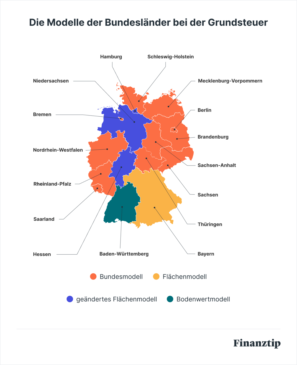 Wenn Deine Immobilie in Baden-Württemberg, Bayern, Hamburg, Hessen oder Niedersachsen liegt, hat das Urteil keine Konsequenzen. Diese Bundesländer nutzen eigene Modelle, um die Grundsteuer festzulegen. Unser Ratgeber gibt Dir einen Überblick über alle Modelle. Allerdings gibt es auch hier Klagen, über die der Bundesfinanzhof 2026 entscheiden wird – und über die wir Dich natürlich informieren werden.