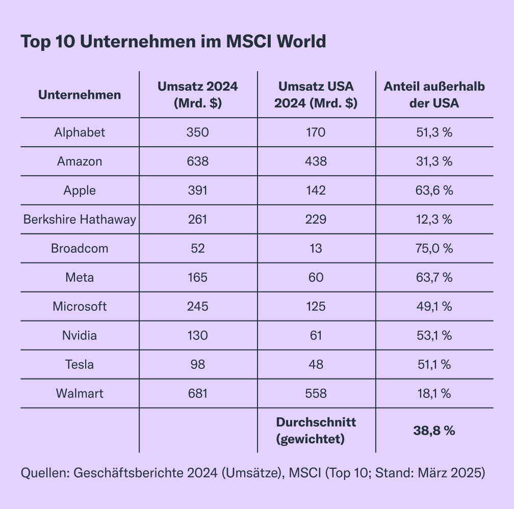 Denn eine entscheidende Sache wird vergessen: Der Sitz eines Weltkonzerns allein entscheidet längst nicht über seinen Erfolg. Die kompletten Top 10 des MSCI World haben ihre Zentralen in den USA – machen aber längst nicht nur dort Geschäfte und damit Umsatz.