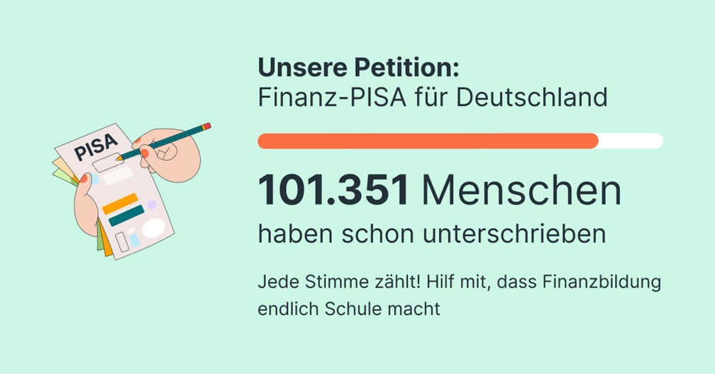 Vor vier Wochen haben wir ein Finanztip-Herzensprojekt gestartet: Mit unserer Petition möchten wir die Politik dazu bewegen, dass Deutschland endlich an der PISA-Studie zur Finanzbildung teilnimmt. Nur so erfahren wir, wie es wirklich um das Finanzwissen junger Menschen steht – um es dann gezielt verbessern zu können.
