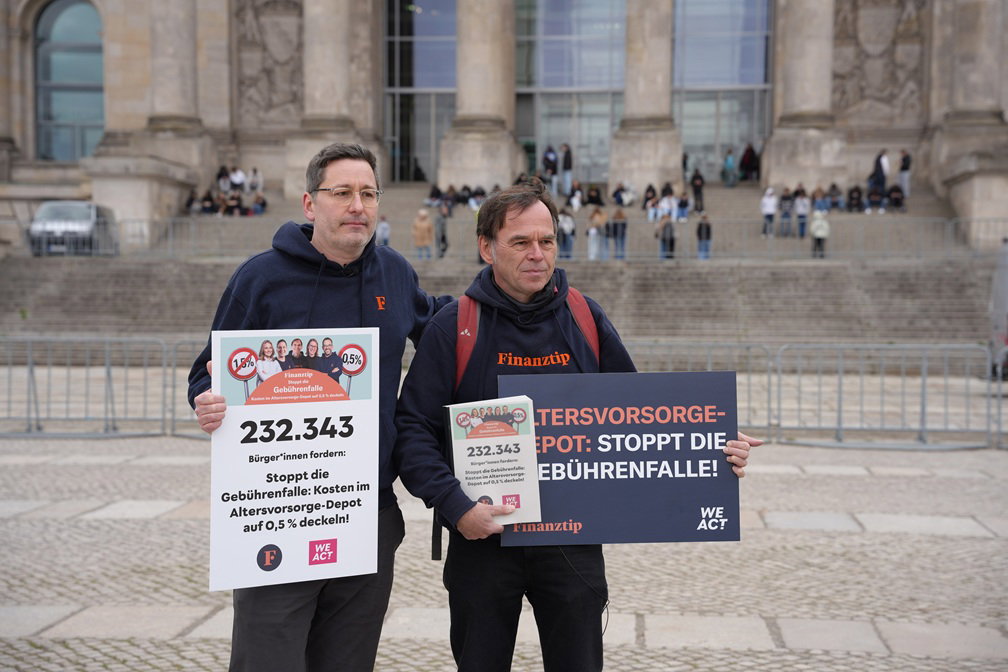 Deshalb fordern wir unter anderem mit einer Petition max. 0,5 % Kosten pro Jahr – und zwar für alle geförderten Produkte, nicht nur das Standardprodukt. Fast eine Viertelmillion Unterschriften sind dabei schon zusammengekommen. Am Donnerstag wollten wir sie vor der entscheidenden Abstimmung im Bundestag übergeben. Doch kein Koalitionsvertreter wollte sie symbolisch entgegennehmen, um den großen Kostenfehler im Gesetzesentwurf noch zu heilen. Beschäftigen muss sich die Politik mit den Forderungen der Finanztip-Community aber.