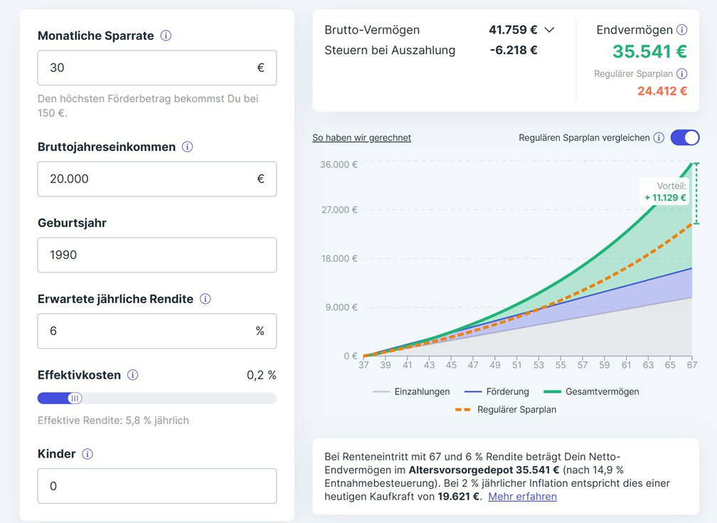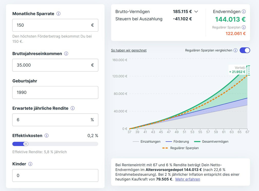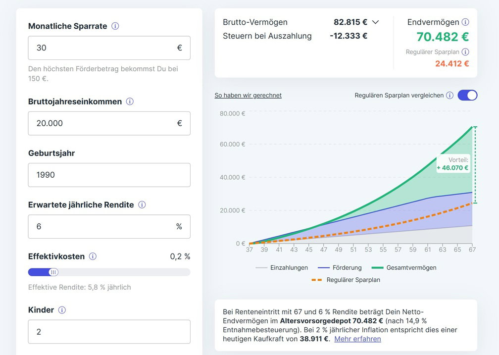 So kommst Du insgesamt auf max. 540 € Grundförderung, bisher waren max. 480 € drin. 5. Volle Kinderzulage schon bei 25 statt 100 € MonatsrateAuch für jedes Kind sollst Du schneller hohe Extra-Förderung bekommen als bisher geplant: Die maximale Kinderzulage von 300 € pro Kind und Jahr soll es jetzt schon ab 25 € Sparrate im Monat geben. Das sind 300 €/Jahr. Du bekommst also für jeden eingezahlten Euro einen Euro Zuschuss vom Staat – bis max. 300 €. Im bisherigen Entwurf hättest Du für die vollen 300 € Kinderzulage 100 € pro Monat einzahlen müssen. Wichtig: Für die Kinderzulage musst Du nicht zusätzlich einzahlen. Zahlst Du sowieso schon z. B. 30 €/Monat bzw. 360 €/Jahr für die Grundförderung von dann 180 € ein und hast ein Kind, bekommst Du die 300 € dafür obendrauf. Heißt: Mit einem Kind bekommst Du für 360 € Einzahlungen 480 € Förderung! Deshalb lohnen sich Kinder im AV-Depot ganz besonders. Wie viel mehr bringt das AV-Depot als ein normaler ETF?Das kannst Du ganz einfach mit unserem Altersvorsorge-Depot-Rechner rausfinden – und zwar nach Steuern. In den Rechner haben wir das neue Fördersystem schon eingebaut. Wie genau er funktioniert, siehst Du per Klick auf “So haben wir gerechnet”. Ein paar Beispiele:Fall 1: Du hast keine Kinder, verdienst 35.000 € brutto und zahlst jedes Jahr 1.800 € bzw. 150 €/Monat ein, um die volle Grundförderung von 540 € mitzunehmen. Dann bringt Dir das AV-Depot über 30 Jahre netto 18 % bzw. 22.000 € mehr als ein ungeförderter Aktien-ETF:
