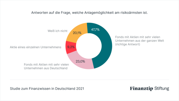 Aktien sind als Bestandteil des Vermögensaufbaus heutzutage praktisch nicht mehr wegzudenken. Aber verstehen die Leute auch das Risiko von Aktien und Aktienfonds? Wir haben nachgefragt! Das Ergebnis: Mehr als die Hälfte der Deutschen erkennt nicht, dass eine Investition in einen weltweiten Index ein geringeres Verlustrisiko beinhaltet als eine Investition beispielsweise in den DAX oder in eine Einzelaktie eines Unternehmens.
