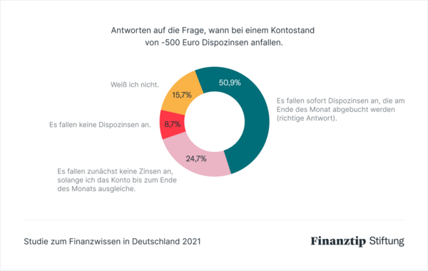 Wir wollten zum Beispiel wissen, wann bei einem Girokonto Dispozinsen anfallen. Und die Antworten sind überraschend: Jeder Zweite weiß nicht, dass Dispozinsen sofort anfallen. Etwa 25 Prozent der Deutschen denken, dass der Dispo kostenlos ist, solange sie das Konto am Monatsende wieder ausgleichen.