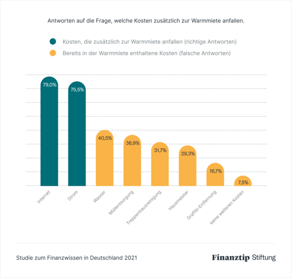 Außerdem haben wir gefragt, ob die Deutschen denn genau wissen, was in ihrer Warmmiete bereits berechnet ist und welche Kosten extra anfallen. Nur ungefähr jeder Vierte bzw. Fünfte weiß, dass die Kosten für Strom und Internet grundsätzlich nicht mit den Nebenkosten abgerechnet werden, sondern Du selbst dafür verantwortlich bist, einen Vertrag mit dem Anbieter abzuschließen.
